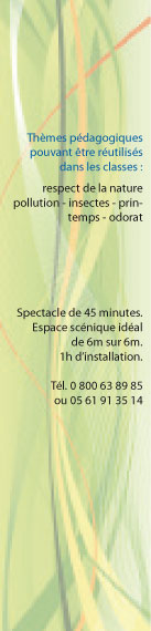Néroline protège la nature est un spectacle sur le thème de la protection de l’environnement. Un spectacle tout plein de fraîcheur et d’humour décapant avec la sorcière Nauséabond 007 et la fée Néroline, la fée des bonnes odeurs. Au cours de la représentation les enfants s’amusent à développer leur sens olfactif grâce à des mini-flûtes à parfums individuelles, prêtées à chacun d’entre eux et réalisées sur mesure pour leurs petits nez gourmands...